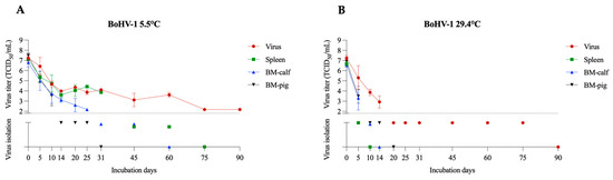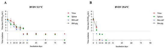 BVDV viability in spleen and bone marrow (BM-calf and BM-pig) in decomposing tissues over 90 days. BVDV titration and virus isolation results at 5.5 °C (A) and 29.4 °C (B). The dotted line indicates the detection limit of the titration assay (1.8 TCID50/mL). Below the dotted line are presented the virus isolation results, with virus isolation negative samples presented over the X axis.