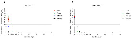 PEDV viability in spleen and bone marrow (BM-calf and BM-pig) in decomposing tissues over 90 days. PEDV titration and virus isolation results at 5.5 °C (A) and 29.4 °C (B). The dotted line indicates the detection limit of the titration assay (1.8 TCID50/mL). Below the dotted line are presented the virus isolation results, with virus isolation negative samples presented over the X axis.