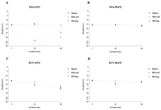 Evaluation of virus nucleic acid detection of the non-enveloped RNA viruses in spleen and bone marrow (BM-calf and BM-pig) in decomposing tissues over a 90-day period. The cycle threshold (CT) values for SVA at 5.5 °C (A) and 29.4 °C (B) and for the FCV at 5.5 °C (C) and 29.4 °C (D). The line at mark 37 represents CT 37, considered the threshold limit for detection.