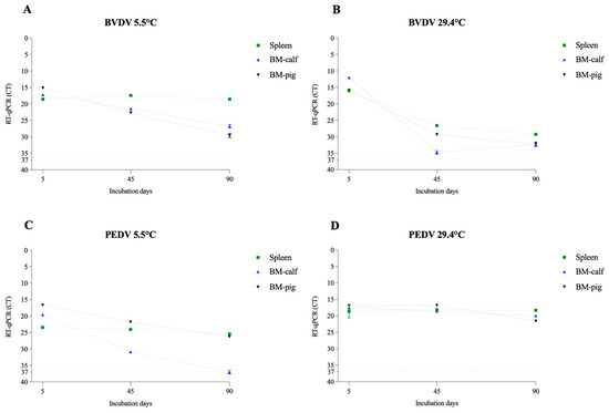 Evaluation of virus nucleic acid detection of the enveloped RNA viruses in spleen and bone marrow (BM-calf and BM-pig) in decomposing tissues over a 90-day period. The cycle threshold (CT) values for BVDV at 5.5 °C (A) and 29.4 °C (B) and for the PEDV at 5.5 °C (C) and 29.4 °C (D). The line at mark 37 represents CT 37, considered the threshold limit for detection.