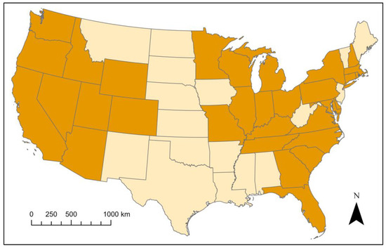 Strangles occurrence data were acquired from multiple sources, such as the Equine Disease Communication Center [14] and University of Kentucky [15] online databases, the Georgia Department of Agriculture, the Wyoming State Veterinary Laboratory, the New York Department of Agriculture, the Montana Department of Livestock, and the Oklahoma Department of Agriculture, Food and Forestry. A total of 601 cases from 31 states were included in our analyses. In this study, the term ‘outbreak’ is used to describe at least a single horse being diagnosed with strangles during a particular time at a particular location. As there can be multiple horses on one barn infected with strangles at a time, we feel that the term outbreak is more inclusive than the term ‘case’. All data included in this study contain date and county of occurrence. Only cases that occurred between 1 January 2018 and 31 December 2022 were used in these analyses. Figure 1 shows which states reported strangles cases within the five-year study period. The number of cases reported by each state can be found in Table S1 and all case information, including county, date of occurrence, and weather data used in our analysis can be found in Table S2.