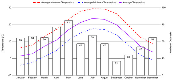 Representation of total number of strangles outbreaks shown with air temperatures. The total number of outbreaks per month across the five-year period is represented by a bar graph. The number inside each bar indicates the total number of cases reported for each month. Temperature data are represented as a line graph with average maximum temperatures shown as a red dashed line, average minimum temperatures as a blue dashed and dotted line, and average temperatures are represented by the purple solid line. The left y-axis denotes temperature (°C), the right y-axis shows the number of outbreaks, and the x-axis is labeled by month.