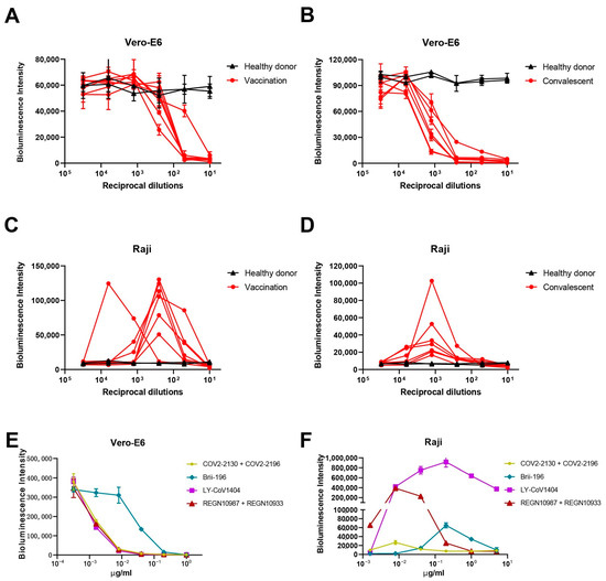 We first tested the impact of serum antibodies on SARS-CoV-2 entry into different cells. The SARS-CoV-2 D614G pseudovirus was used to infect the ACE2-expressing Vero-E6 cells or the FcR-expressing Raji cells in the presence of vaccination (n = 7), convalescent (n = 7), or healthy donor (n = 2) sera. All convalescents had reported mild symptoms or were asymptomatic. On Vero-E6 cells, we observed significantly lower luciferase levels in vaccination (Figure 1A, red lines) or convalescent (Figure 1B, red lines) sera compared to healthy control sera (black lines), indicating the viral neutralization activities of the vaccination/convalescent sera, similar to what we previously reported [26,27,28,29]. However, when we tested them on Raji cells, which are cloned B cells highly expressing FcγRIIB [30], we found that both vaccination and convalescent sera (Figure 1C,D, red lines), at certain concentrations, significantly increased luciferase signals compared to control sera (black lines) using the same SARS-CoV-2 D614G pseudovirus. Although the convalescent group had higher neutralization titers than the vaccination group on Vero-E6 cells (Supplementary Figure S1A), the maximum increase in pseudovirus entry of the convalescent group was lower than that of the vaccination group on Raji cells (Supplementary Figure S1B). No correlation was observed between the maximum ADE infectivity fold change and serum neutralization ID50 value (p = 0.6457, R2 = 0.4845) (Supplementary Figure S1C). These results indicated that polyclonal sera from COVID-19 vaccinees and convalescents could induce ADE of SARS-CoV-2 pseudoviral infection on FcR-expressing cells in vitro.