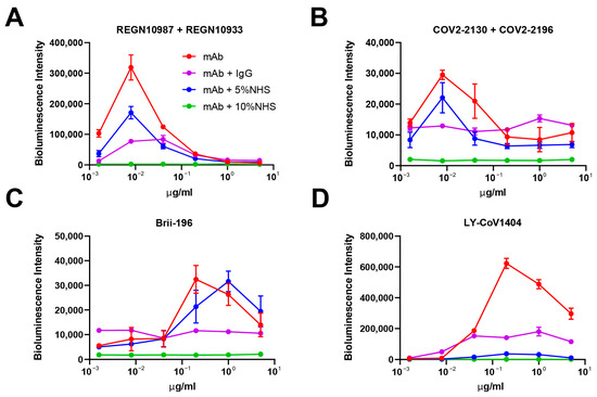 In vitro ADE activities of SARS-CoV-2 neutralizing mAbs could be eliminated by adding human serum/IgG. ADE of SARS-CoV-2 pseudoviral infection on Raji cells mediated by (A) REGN10987 + REGN10933, (B) COV2-2130 + COV2-2196, (C) Brii-196, and (D) LY-CoV1404. Cells were cultured without or with human IgG (100 μg/mL), 5% or 10% NHS, and luciferase activity in the cell lysates was determined at 24 hpi. The experiment was performed in triplicate; means and standard deviations are shown.