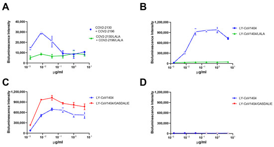To further prove the observed ADE depend on the Fc–FcR interactions, we introduced mutations in the antibody Fc region to abolish its binding to FcRs. L234A/L235A (LALA) mutations, known to abolish Fc-mediated effector functions by preventing mAbs from binding to FcRs but without impacting mAbs’ neutralizing ability [36], were selected. The ADE activity of COV2-2130 + COV2-2196 and LY-CoV1404 was completely abolished by introducing the LALA mutation in the Fc portion of the antibodies (Figure 3A,B). On the other hand, we also generated mAbs with G117A, S120D, A211L, and I213E combined mutations (GASDALIE), known to enhance the antibody-binding affinity to FcγR [37]. As expected, the ADE activity of LY-CoV1404/GASDALIE was further enhanced compared to the WT antibody (Figure 3C). It is noteworthy that when we detected the ADE activity with the most recently emerged Omicron subvariants, XBB.1.5, neither LY-CoV1404 nor LY-CoV1404/GASDALIE showed any ADE activity on Raji cells (Figure 3D). This could be explained by the complete loss of binding and neutralization activity of LY-CoV1404 against XBB.1.5 [38]. These results indicated that the in vitro ADE activities dependent on antibodies’ Fc interaction with FcRs could be abolished by mutating the Fc region.
