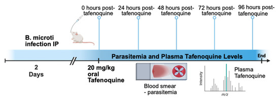 Experimental model for tafenoquine treatment of babesiosis. Mice were infected with B. microti. Two days post-infection, mice were treated with 20 mg/kg tafenoquine by oral gavage. Blood was collected from mice 0, 24, 48, 72, and 96 h after tafenoquine treatment to monitor parasitemia by thin blood smear and plasma tafenoquine levels by liquid chromatography-tandem mass spectrometry.