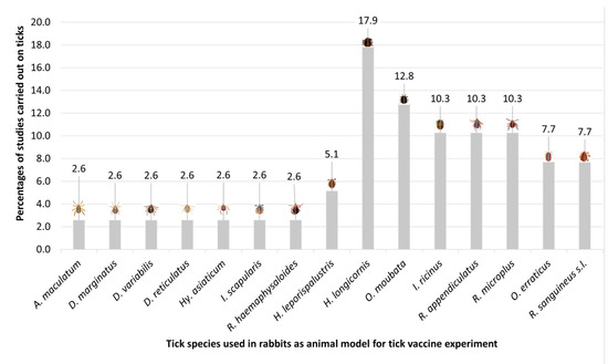 New Zealand white, Californians, Japanese white, and Flemish lop-eared rabbit breeds were studied as model hosts for R. appendiculatus, R. microplus, and R. sanguineus s.l. in experiments carried out in Brazil, Cuba, Kenya, Japan, and Mexico, which proved to be successful in evaluating anti-tick proteins. Regarding the evaluation of proteins for the development of vaccines against Rhipicephalus species using rabbit as an animal model, a total of 15 molecules, to date, have been evaluated in rabbits for vaccine development against Rhipicephalus species, the most frequent tick genus in this kind of study.