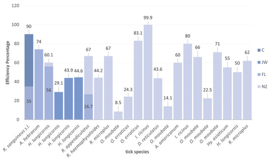 Vaccine efficiency (percent reduction of tick infestation) against different ticks, according to the breed of rabbits used for immunization. NZ: New Zealand. JW: Japanese white. C: Californians. FL: Flemish lop-eared rabbit.