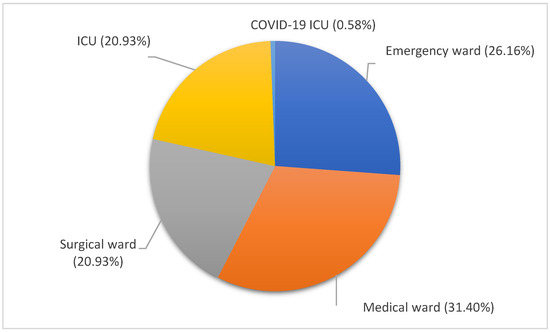 Of 172 patients supported by corresponding clinical data, 54 (31.40%) patients were hospitalized in medical wards, 45 (26.16%) in the emergency unit, 36 (20.93%) in each of the surgical and ICU wards, and 1 (0.58%) in a COVID-19 unit (Figure 1).