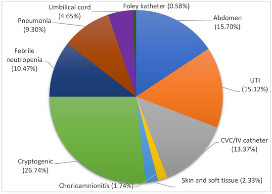 Source of bloodstream infections. Cryptogenic, light green, 26.74%; abdomen, blue, 15.70%; UTI, orange, 15.12%; CVC/IV catheter, gray, 13.37%; febrile neutropenia, dark blue, 10.47%; pneumonia, brown, 9.30%; umbilical cord, purple, 4.65%; skin and soft tissue, light blue, 2.33%; chorioamnionitis, yellow, 1.74%; Foley catheter, dark green, 0.58%.
