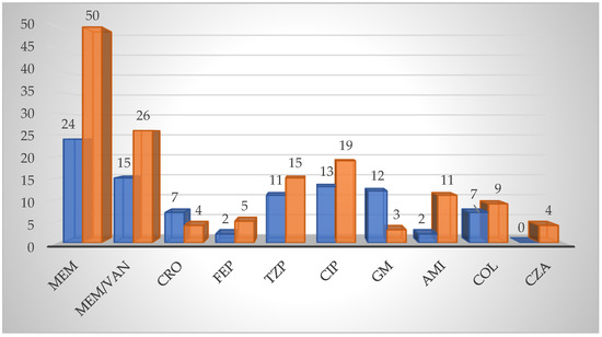 Antibiotic therapy regimes. Empirical antimicrobial therapy, blue; Targeted antimicrobial therapy, orange. Abbreviations: MEM—meropenem; VAN—vancomycin; CRO—ceftriaxone; FEP—cefepime; TZP—piperacilin/tazobactam; CIP—ciprofloxacin; GM—gentamicin; AMI—amikacin; COL—colistin; CZA—ceftazidime/avibactam.