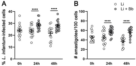 B. burgdorferi coinfection increases L. infantum infection rates and cellular burden. DH82 cells were exposed to L. infantum (1:10 MOI) for 24 h, and then exposed to live B. burgdorferi (1:25 MOI) for indicated time points. Cells were fixed with methanol and stained using HEMA 3 solutions. Frequencies of L. infantum-infected cells (A) and number of amastigotes (B) per 100 DH82 post-coinfections with live B. burgdorferi were assessed through light microscopy (100×). Blind and independent assessments were performed by two researchers. Data represent mean ± SEM of three independent experiments, performed in triplicates for each condition. N = 10–23 coverslips per group. Two-way ANOVA, Tukey’s multiple comparisons test. p **** < 0.0001. Li: L. infantum infection. Li + Bb: L. infantum and B. burgdorferi coinfection.