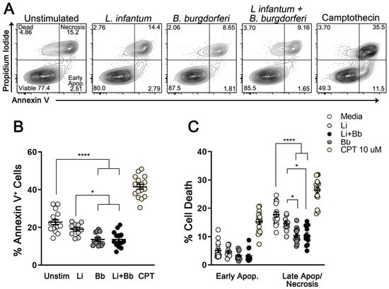 To explore the possible mechanism by which B. burgdorferi infections leads to increased parasite load in DH82 cells, we investigated the rate of apoptosis and necrosis of L. infantum-infected DH82 cells in the presence or absence of B. burgdorferi spirochetes via flow cytometry using Annexin V and PI staining (gating strategy shown in Figure S3). Treatment with Camptothecin (CPT), a topoisomerase I inhibitor, was used as positive control for cell death (p < 0.0001; as compared to all groups) (Figure 2A). The frequency of L. infantum-infected cells undergoing cell death (Annexin V+) did not significantly differ from uninfected cells (19.1% vs. 22.8%, respectively) over 24 h in culture. On the other hand, cells coinfected with L. infantum and B. burgdorferi for 24 h showed significantly lower death rates compared to uninfected cells (40.1% decrease; p < 0.0001) and L. infantum-infected cells (28.4% decrease; p = 0.04).