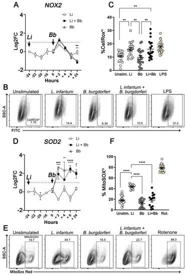 Altered production of reactive oxygen species (ROS) during L. infantum and B. burgdorferi coinfection in DH82 cells. Cells were exposed to L. infantum promastigotes and/or B. burgdorferi spirochetes. Gene expression of NOX2 (A) and SOD2 (D) were quantified via quantitative PCR and normalized using ACTB as an endogenous control. Data represent log transformed-fold change mean values relative to uninfected DH82 cells ± SEM of three independent experiments, with significance assessed via two-way ANOVA, Tukey’s multiple comparisons test. * L. infantum and B. burgdorferi coinfections vs. L. infantum infection. +B. burgdorferi infection vs. L. infantum infection. (A) p ** = 0.002, p ++ = 0.0014, (D) p * = 0.0114, p + = 0.0157, p ++ = 0.0022; p *** = 0.0006, p +++ = 0.0002, p ****/++++ < 0.0001. Representative scatter plots showing percentages of CellROXhi (B) and MitoSOXhi (E) populations after exposure to medium, L. infantum promastigotes, B. burgdorferi spirochetes, and respective positive controls (LPS and rotenone). Percentage of CellROXhi (C) and MitoSOXhi (F) cells after B. burgdorferi exposure and indicated stimulations. Statistical significance was estimated using ordinary one-way ANOVA with post hoc Tukey test. (C) p ** = 0.0071 (unstimulated vs. Li/Li + Bb), 0.0016 (Bb vs. Li+Bb), (F) p **** < 0.0001, mean ± SEM of triplicate experiments.