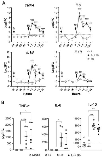 Macrophages produce high levels of pro-inflammatory cytokines upon exposure to B. burgdorferi [34,56]. However, L. infantum is known to employ multiple mechanisms to dampen pro-inflammatory responses including upregulating protein tyrosine phosphatase activity and lipid raft disruption to inhibit JAK/STAT, PKC, NFkB, and MAPK signaling cascades downstream of pathogen recognition receptors (PRRs), such as TLRs and cytokine receptors such as IFNγR [57,58,59]. Thus, we hypothesized that B. burgdorferi-induced macrophage cytokine production would be attenuated in L. infantum-infected DH82 cells. RT-qPCR was performed to measure cytokine transcript levels in DH82 cells before and after coinfection (Figure 4).