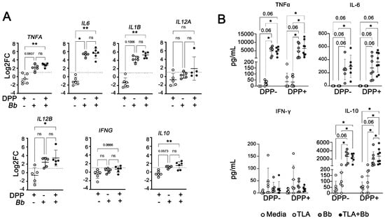 Clinical control of VL depends on Type I immune responses characterized by IFNγ production, primarily by activated CD4+ T cells [3,60]. IFNγ is a major activator of macrophages, sustaining microbicidal responses and enhancing antigen presentation [61,62]. As B. burgdorferi infection promoted significant pro-inflammatory responses in L. infantum-infected DH82 macrophages, we next evaluated whether experimental B. burgdorferi exposure altered inflammatory or regulatory cytokine production from primary dog immune cells. We performed ex vivo stimulation assays with either vehicle (media), live B. burgdorferi spirochetes (1:10 MOI) live B. burgdorferi spirochetes (1:10 MOI) comparing PBMC responses from six dogs with (DPP+) and five without (DPP-) L. infantum seroreactivity and clinical evidence of L. infantum infection. Fold changes are normalized to unstimulated L. infantum-seronegative dog cell transcript levels (Figure 5A).