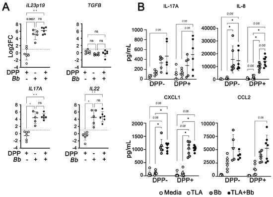 PBMCs from L. infantum-seronegative and seropositive dogs were stimulated with B. burgdorferi spirochetes and/or TLA and gene expression analyses and ELISA were performed (Figure 6). There was upregulation of IL23p19, IL17A, and IL22 transcripts in B. burgdorferi-exposed PBMCs from both L. infantum-seronegative and seropositive dogs compared to unstimulated cells (Figure 6A,B). We did not observe differential gene expression of TGFB (Figure 6A).