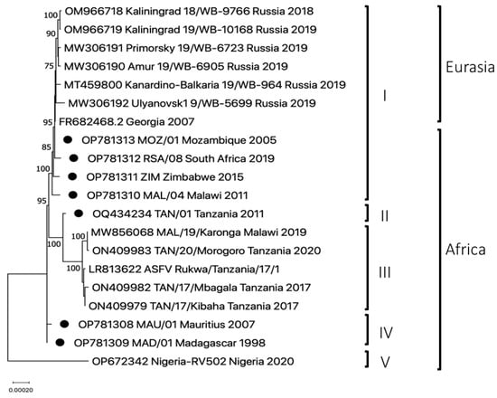 Maximum likelihood phylogenetic tree using the complete genome sequences of genotype II ASFVs from seven SADC countries, Georgia, Russia and Nigeria. The complete genome sequences generated in this study are indicated with black dots, whilst the remaining sequences were obtained from GenBank. Bootstrap support values from 100 replications, ≥75 are shown next to the relevant nodes, with the five major clades recovered being indicated by Roman numerals (I–V).