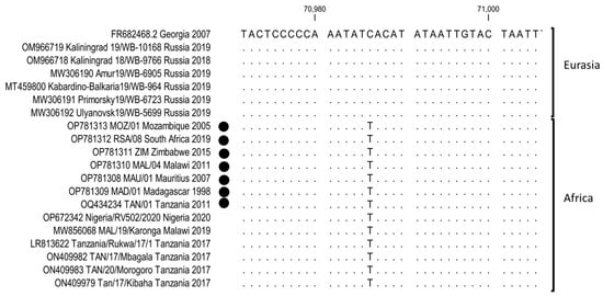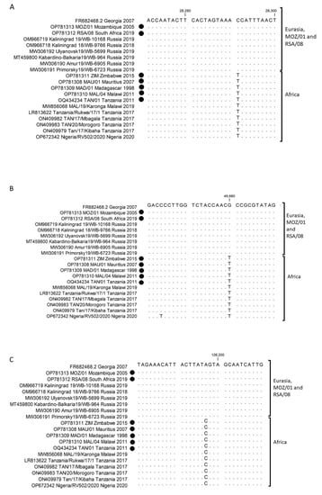 The newly-generated complete genome sequences were compared against the available genotype II ASFVs sequences, with special emphasis to the SNPs between Georgia 2007/1 (FR682468.2) and the African isolates. A single synonymous SNP in the open reading frame (ORF) EP402R (I118I) was identified between MOZ/01/2005 and Georgia 2007/1 (Supplementary Table S2). This SNP was a “T” in all the isolates from Africa, compared to a “C” in Georgia 2007/1 as well as all the isolates from Eurasia (Figure 3). Additionally, 51 non-synonymous (Supplementary Table S3), 40 synonymous (Supplementary Table S2) and 6 single nucleotide polymorphisms (SNPs) altering reading frames, and 18 SNPs in intergenic regions (Supplementary Table S4), were observed. SNPs were identified between the newly generated sequences and Georgia 2007/1. The sequence ZIM/2015 had 11 unique non-synonymous and three unique synonymous SNPs (Supplementary Tables S2 and S3). In contrast, RSA/08/2019 had seven unique non-synonymous and five unique synonymous SNPs, whilst MAL/04/2011 had nine and six, respectively. No unique SNPs were identified in MAD/01/1998, but all the SNPs detected in this sequence were also observed in MAU/01/2007 (Supplementary Tables S2 and S3). Four synonymous SNPs were unique to TAN/01/2011, whilst it shared 15 non-synonymous and ten synonymous SNPs with the previously determined sequences from Tanzania and Malawi (LR813622, ON409982, ON409983, ON409979 and MW856068) (Tables S2 and S3).