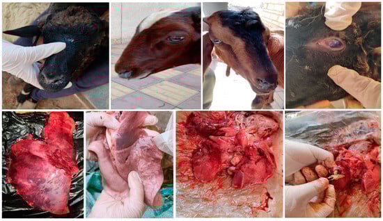 Sheep and goats admitted to the veterinary teaching hospital of Zagazig University with respiratory distress symptoms such as dyspnea, cough, nasal discharge (purulent and mucopurulent may be tinged with blood), fever, pneumonia, and crusts around the nasal orifice were included in the present study (Figure 1). Of a total of 200 apparently pneumonic animals, 141 (70.5%) were female and 59 (29.5%) were male. The majority of the animals (66.5%) were young, aged one year or younger. The animals were admitted from various localities in Sharkia Governorate: 68 (34%) from Zagazig, 66 (33%) from Abou Hammad, 25 (12.5%) from Abu Kibir, and 41 (20.5%) from Minya Al Qamh. All sheep and goats were indigenous breeds raised for meat production and managed under extensive (68.5%) and semi-intensive (31.5%) production systems. Nasal swabs were collected from 156 animals, comprising 115 sheep and 41 goats. The remaining 44 samples (26 sheep and 18 goats) were lung samples with lesions submitted for necropsy examination (Figure 1).