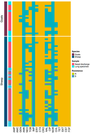 Heatmap representation of the antimicrobial resistance patterns of 72 K. pneumoniae isolates recovered from nasal discharge and lung samples of sheep and goats.