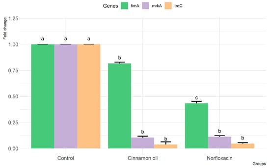 The relative mRNA expression levels of biofilm-forming genes in strong biofilm-forming K. pneumoniae-resistant isolates before and after treatment with cinnamon oil and norfloxacin (different letters indicate statistically significant differences).