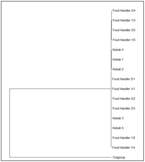 Five CPS isolated from the kebabs and identified as S. aureus were characterized. The same characterization was carried out on 10 CPS isolated from the two food handlers after the identification as S. aureus. All the strains had the same toxigenic molecular profile harboring seb and sep genes.