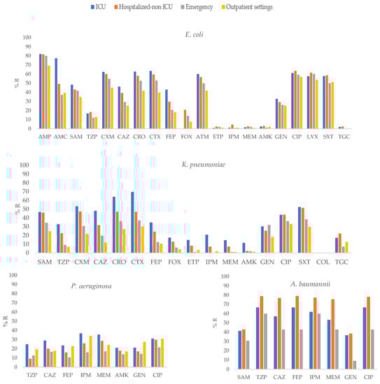 AMR is considered one of the key determinants of patient outcome, and patients in the ICU are at a higher risk of acquiring antimicrobial-resistant infections, owing to the use of invasive devices, clinical condition, and increased exposure to antibiotics [23]. In our study, we detected higher antibiotic resistance in isolates obtained from patients in ICU settings than those in other settings for E. coli and K. pneumoniae (resistance to SAM, CAZ, CRO, CTX, FEP, and IPM; p ≤ 0.01) and for P. aeruginosa (resistance to TZP, FEP, IPM, and MEM, p ≤ 0.05).