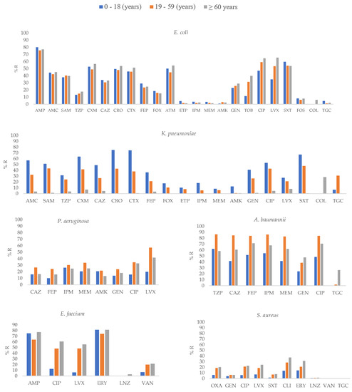 E. coli isolates recovered from the ≥60 years age group showed higher resistance to most antibiotics, including CXM, CIP, LVX (p ≤ 0.01) and TOB (p = 0.01; Supplementary Table S2, Figure 2). In contrast, in K. pneumoniae, isolates obtained from the 0–18 years age group showed higher resistance to SAM, CXM, CAZ, CRO, CTX, FEP, AMK, GEN, and SXT (p ≤ 0.01), ETP, and IPM (p ≤ 0.05). Regarding A. baumannii, higher resistance to CAZ, FEP, IPM, MEM, and CIP (p ≤ 0.01) in the 19-59 years group was found; similar results were observed for P. aeruginosa. For E. faecium and S. aureus, isolates recovered from the ≥60 years age group showed higher resistance to CIP and LVX (p ≤ 0.01) and OXA, CIP, LVX, CLI, and ERY (p ≤ 0.01), respectively.