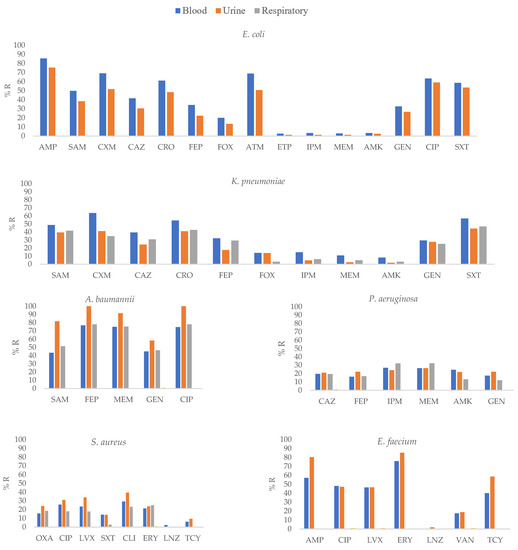 For the AMR analysis, only one isolate per patient was selected. The results were reported as antibiotic-susceptible, intermediate, or resistant according to the Clinical & Laboratory Standards Institute (CLSI) [13]. The data from patients were encrypted to protect personal information. Antimicrobial susceptibility testing (AST) was performed using amikacin (AMK), amoxicillin–clavulanic acid (AMC), ampicillin (AMP), aztreonam (ATM), ampicillin–sulbactam (SAM), cefepime (FEP), cefoxitin (FOX), ceftazidime (CAZ), ceftriaxone (CRO), cefuroxime (CXM), ciprofloxacin (CIP), clindamycin (CLI), cefotaxime (CTX), erythromycin (ERY), ertapenem (ETP), gentamicin (GEN), imipenem (IPM), linezolid (LNZ), levofloxacin (LVX), meropenem (MEM), oxacillin (OXA), tetracycline (TCY), tigecycline (TGC), piperacillin–tazobactam (TZP), tobramycin (TOB), trimethoprim–sulfamethoxazole (SXT), and vancomycin (VAN).