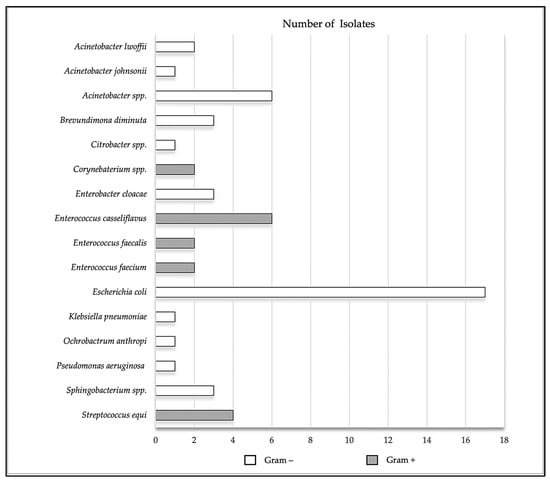 Of the 55 bacterial isolates, 39 (70.9%) were Gram-negative bacteria of which 22 (56.4%) belonged to Enterobacterales, represented by 17 Escherichia coli, 3 Enterobacter cloacae, 1 Citrobacter spp., and 1 Klebsiella pneumoniae; and 17 were Gram-negative non-fermenting rod bacteria, represented by 9 Acinetobacter spp. (2 A. lwoffii, 1 A. johnsonii, and 6 Acinetobacter spp.), 3 Brevundimonas diminuta, 3 Sphingobacterium spp., 1 Pseudomonas aeruginosa, and 1 Ochrobactrum anthropi. In contrast, 16 (29.1%) of the isolates were Gram-positive bacteria: 10 Enterococcus spp. (6 E. casseliflavus, 2 E. faecalis, and 2 E. faecium), 4 Streptococcus equi, and 1 Corynebaterium sp. (Figure 1).