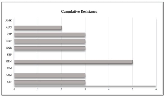 Of all antibiotics tested against the Enterobacterales and Pseudomonas spp. (n = 23), the third generation cephalosporins were shown a 26.1% resistance, followed by GM. In the strains of the Acinetobacter spp. tested, AMP was shown the greatest resistance with 44.4% (Figure 2). Only 9.3% (n = 32) of isolates showed MDR, corresponding to Escherichia coli, Enterobacter cloacae, and Klebsiella pneumoniae; also, 18.8% of isolates presented resistance to two or more classes of antibiotics. On the contrary, the carbapenems IPM and ETP were sensitive to all isolates (Table 2).