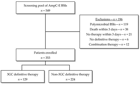 A total of 549 patients with 3GC-susceptible AmpC-E BSI underwent screening for inclusion. Among them, 196 patients were excluded primarily due to the presence of polymicrobial index blood culture, predominantly associated with intra-abdominal and catheter-related infections. Ultimately, 353 patients were enrolled in the study, with 129 receiving the 3GC definitive therapy and 224 receiving the non-3GC definitive therapy (Figure 1).