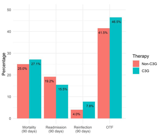 The primary outcome of the OTF was comparable between therapy groups (43.1% vs. 36.9%, p = 0.37). The simple logistic regression model showed similar odds of the OTF with the 3GC definitive therapy compared to non-3GC definitive therapy (OR 1.30, 95%CI 0.71–2.36). There was no statistically significant difference between groups regarding 90-day all-cause mortality (survival probability of 78.7% vs. 78.5%, p = 0.77), 90-day readmission (20.0% vs. 24.7%, p = 0.38), and in-hospital mortality (20.0% vs. 9.9%, p = 0.051). Reinfection within 90 days was higher in the non-3GC-therapy group (1.6% vs. 9.2%, p = 0.028). Median length-of-stay was higher in the 3GC-therapy group (30 days vs. 20 days, p = 0.001) (Supplementary Tables S7 and S8).