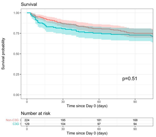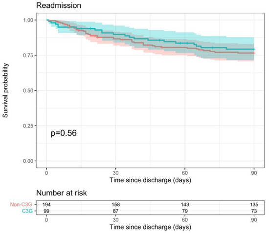 Readmission within 90 days of hospital discharge showed no significant difference between the 3GC- and non-3GC-definitive-therapy groups (90-day readmission probability of 20.7% vs. 23.4%, p = 0.56) (Figure 5). There was no association with severity indicators and therefore no need for statistical adjustment.