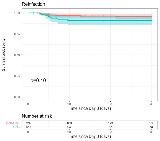 Reinfection with the same pathogen within 90 days of the index blood culture was similar for both therapy groups (90-day reinfection probability of 9.1% vs. 4.4%, p = 0.10) (Figure 4). This outcome was slightly associated with ICU admission in the multiple analysis (p-value < 0.1), but the adjusted model did not change the conclusion either (p = 0.19).