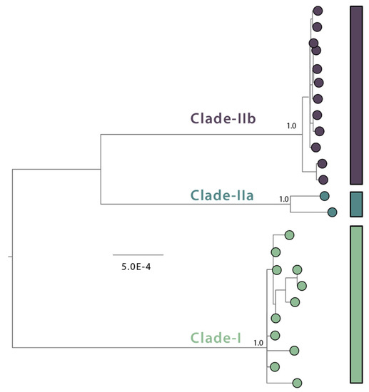- Scarpa, F.; Sanna, D.; Azzena, I.; Cossu, P.; Locci, C.; Angeletti, S.; Maruotti, A.; Ceccarelli, G.; Casu, M.; Fiori, P.L.; et al. Genetic Variability of the Monkeypox Virus Clade IIb B. 1. J. Clin. Med. 2022, 11, 6388. [Google Scholar] [CrossRef]