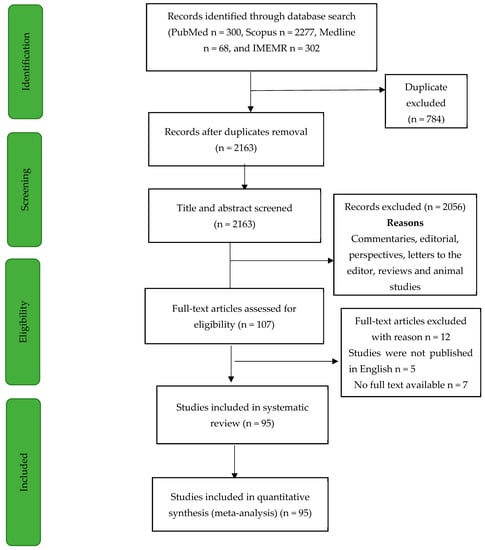 The PRISMA (Preferred Reporting Items for Systematic Reviews and Meta-Analyses) criteria [18] were used in this study to ensure that no essential data were missed. Databases, including PubMed, SCOPUS, MEDLINE, and Index Medicus for the Eastern Mediterranean Region (IMEMR) were scoured for relevant articles. The search terms “Toxoplasma gondii” OR “Toxoplasma infection” AND Pregnancy OR “Pregnant women” ORpregnan* OR Antenatal or Prenatal OR Gravidity OR Parturition OR Maternal AND Afghanistan OR Bahrain OR Djibouti OR Egypt OR Iran OR Iraq OR Jordan OR Kuwait OR Lebanon OR Libya OR Morocco OR Pakistan OR Palestinian OR Qatar OR “Saudi Arabia” OR Somalia OR “South Sudan” OR Sudan OR Syria OR Tunisia OR “United Arab Emirates” OR Yemen were performed till 30 January 2023 with eligible papers published in the English language. Articles were included if they met the following criteria: if the study was conducted in one of the designated WHO Eastern Mediterranean Region countries, and if it was a cross-sectional, case-control, and cohort-based population study.
