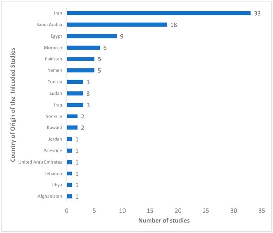 Distribution of the included studies by country of study origin. The figure above shows the number of studies found in each of the countries in the WHO Eastern Mediterranean region. The figure shows the number of studies from countries in descending order.
