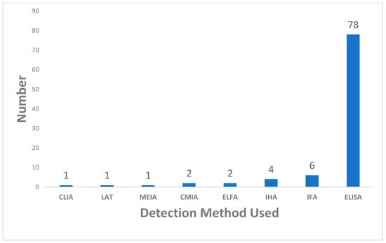 Distribution of the included studies by the method used. The figure shows the number of studies that used various methods to detect the antibodies of Toxoplasma gondii. The figure shows studies based on the method of detection of antibodies in ascending order.