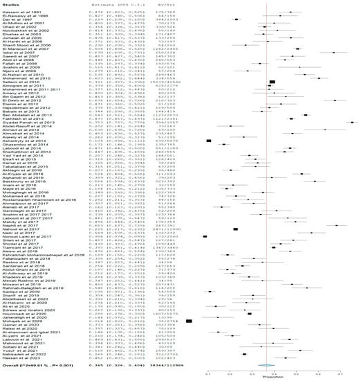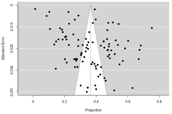 To determine the pooled seroprevalence of Toxoplasma gondii, a total of 112,886 pregnant women from 95 studies from eighteen WHO Eastern Mediterranean Region countries were included in the quantitative analysis (meta-analysis). In total, 38,364 pregnant women were positive for anti-Toxoplasma gondii with a pooled seroprevalence of 36.5% (95%CI: 32.6–40.4) with a median value of 35.64%, the 25% and 75% interquartile ranges were 26.67% and 47.22%, with range values of 1.38–75.30% and 99.61% heterogeneity, indicating variability in the included studies as shown in Figure 4. The funnel plot shows a mix of studies of small- and large-size samples, as shown (Figure 5), and the Egger’s regression asymmetry test (p = 0.014) and Kendall’s Tau test (p = 0.524) shows publication bias.