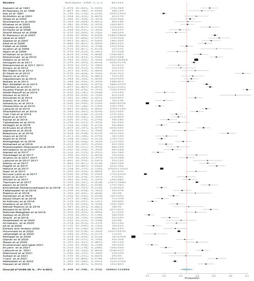 Toxoplasma gondii infection is managed by elimination after the first infection through cell-mediated immunity acquired by immunocompromised patients [12,13]. Bradyzoites of Toxoplasma gondii will become encysted in a host’s heart, liver, kidney, brain or skeletal muscle, and due to the high affinity of Toxoplasma gondii for nerve cells, cysts are also detected in the brain [10]. Pregnant women should avoid coming into contact with cat litter and dirt, which may contain oocysts of Toxoplasma gondii, in addition to significant risk from ingesting food contaminated with the parasite [14]. The significance of risk-control methods in using a “One-Health” approach to eradicating Toxoplasma infections cannot be emphasized. This is because swallowing tissue cysts has been less of a concern than the possibility of environmental transmission of oocysts [14,15]. Oocyst consumption, passed in infected cats’ feces, is the most common transmission route of Toxoplasmosis in the general population. Toxoplasmosis is an infection that may be passed from mother to child during pregnancy (vertical transmission), and transmission is most likely to occur in the third trimester of pregnancy [16]. Transplacental transmission in acute Toxoplasma gondii infection has been associated with many adverse outcomes, including stillbirths, congenital malformations, and deaths in newborns in immunocompromised mothers [11]. Local and systemic brain lesions, pneumonia, chorioretinitis, systemic infection, coma, and even death are all possible results [17]. Although a tight association between man and cats, the reservoir for the disease, has been widely recognized, the extent of the burden of Toxoplasma gondii in the WHO Eastern Mediterranean Region population is unknown [17]. This study aimed to perform a systematic literature review and meta-analysis to determine the pooled seroprevalence of Toxoplasma gondii among pregnant women in the WHO Eastern Mediterranean Region and determine maternal–fetal outcomes in pregnant women.
