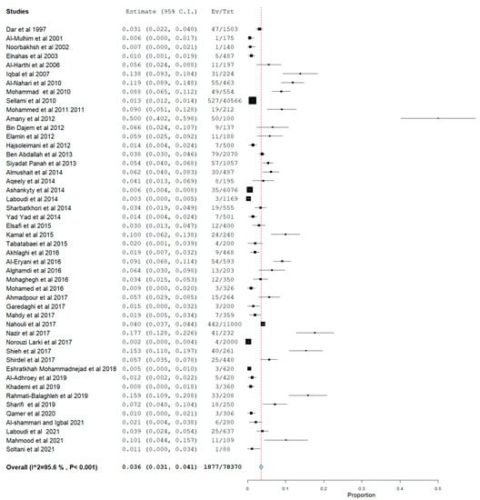 Prevalence of Toxoplasma gondii IgM Seropositive in Pregnant Women in WHO Eastern Mediterranean Region. Figure shows the Toxoplasma gondii IgM seropositivity estimate, which is the cumulative independent study IgM seroprevalence. The seropositive prevalence was 3.6% with significant (p < 0.05) heterogeneity of 95.6%. Ev means the number of events, while Tr means total numbers.