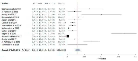 Prevalence of Both IgM and IgG Seropositivity of Toxoplasma gondii in Pregnant Women in WHO Eastern Mediterranean Region. The figure presents the estimate of the Toxoplasma gondii IgG and IgM seropositivity, the cumulative independent study seroprevalence. The seropositive prevalence was 3.0% with significant (p < 0.05) heterogeneity of 93.2%. Ev means number of events, while Tr means total numbers.
