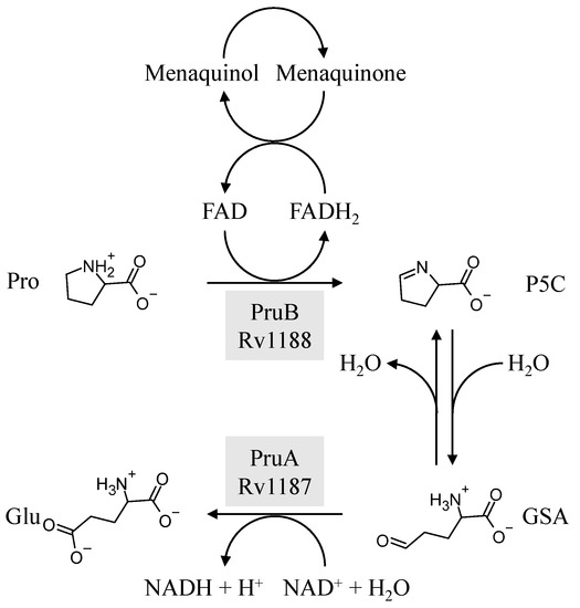 Proline oxidation involves the conversion of proline to ∆1-pyrroline-5-carboxylic acid (P5C, Figure 1) via catalyzation by proline dehydrogenase, using FAD as a cofactor. P5C exists in tautomeric equilibrium with glutamate-semialdehyde (GSA), which is converted into glutamate by a NAD+-dependent ∆1-pyrroline-5-carboxylate dehydrogenase. However, the tertiary/quaternary structures of the enzymes catalyzing these reactions differ from organism to organism [9]. Some bacterial species possess a bifunctional enzyme that accomplishes the conversion of proline into glutamate [10], while other bacteria have a trifunctional enzyme in which an additional DNA-binding domain acts as a transcriptional regulator, as seen in Escherichia coli PutA [11]. However, all eukaryotes and some bacteria, including M. tuberculosis [1,4,7,8], are restricted to pairs of monofunctional enzymes [12,13]. In mycobacteria, these enzymes are encoded by pruA and pruB and rv1187 and rv1188, respectively.