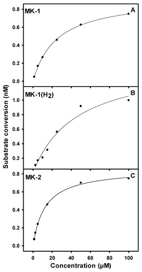 Representative Michaelis–Menten curves for PruB showing the effects of MK-1 (Panel (A)), MK-1(H2) (Panel (B)), or MK-2 (Panel (C)) in the presence of saturating concentrations of proline (20mM). Assays contained 25 ng of PruB in 200 µL of 20mM of Tris-HCl at pH 7.0 and were incubated at 25 °C for 30 min. Activities were monitored following the decrease in the absorbance at 270 nm. Calculated kinetic parameters can be found in Table 2.