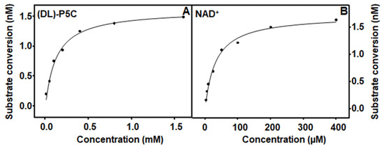 Representative Michaelis–Menten curves for PruA showing the effects of the P5C concentration in an assay at a 0.2-millimolar NAD+ (Panel (A)) concentration and a 0.3-millimolar P5C (Panel (B)) concentration. Assays contained 500 ng of PruA in 200 µL of 20 mM of Tris-HCl at pH 7.0 and were incubated at 25 °C for 30 min. Activities were monitored following the increase in the absorbance at 340 nm. The calculated kinetic parameters can be found in Table 3.