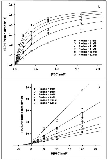 Inhibition of PruA by L-proline. Michaelis–Menten curves are shown in Panel (A). The proline concentration varied from 0 to 32 mM and the P5C concentration varied from 0.1 to 1.6 mM in 20 mM Tris-HCl at pH 7.0 at 25 °C for 30 min. Panel (B) shows the double reciprocal plots of the same data. Error bars indicate the standard deviation of the mean of three independent experiments. The KIproline (6.7 mM) was calculated using the fit to a competitive inhibition model (Equation (1)).