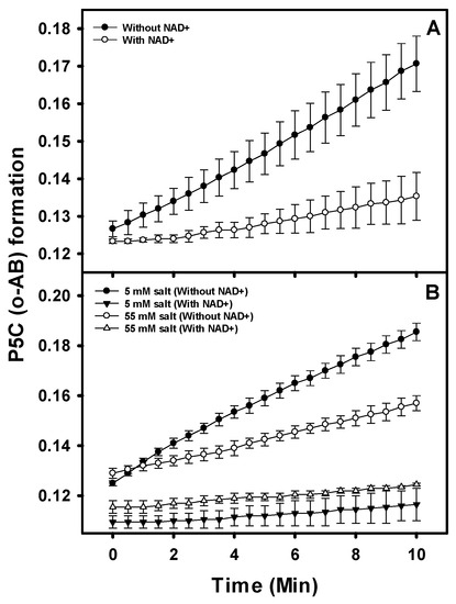 Intermediate P5C-GSA trapping with o-aminobenzaldehyde. P5C/GSA is bound by o-aminobenzaldehyde (o-AB), forming the dihydroquinazolinium complex that is detectable at 443 nm. The reaction mixtures contained 20 mM of Tris-HCl (pH 7.0), 100 µM of UQ1, 0.2 mM of NAD+, 20 mM of proline, and equimolar concentrations (0.5 µM) of PruB and PruA enzymes (Panel (A)). Reactions were also performed in the presence of low and high salt concentrations (Panel (B)). Error bars indicate the standard deviation of the mean of three independent experiments.