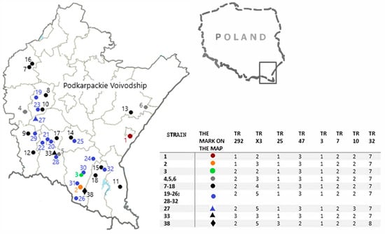 - Orłowska, B.; Krajewska-Wędzina, M.; Augustynowicz-Kopeć, E.; Kozińska, M.; Brzezińska, S.; Zabost, A.; Didkowska, A.; Welz, M.; Kaczor, S.; Żmuda, P.; et al. Epidemiological characterization of Mycobacterium caprae strains isolated from wildlife in the Bieszczady Mountains, on the border of Southeast Poland. BMC Vet. Res. 2020, 16, 362. [Google Scholar] [CrossRef] [PubMed]